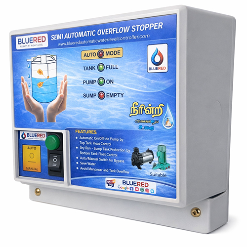 The BLUERED Semi Automatic Overflow Stopper is a practical and cost-effective solution to prevent overhead tank overflow. It uses a top tank float sensor to automatically stop the motor when the tank reaches full level, while allowing manual start control through the panel switch.